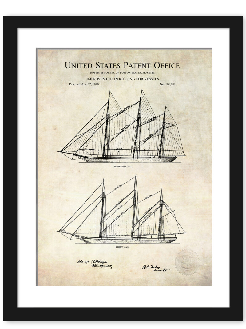 Delve into the golden age of sail with this exquisite print of Robert B. Forbes’s 1870 patent for sails and rigging. This artwork is steeped in maritime heritage, capturing the intricate design that powered the grand vessels of yesteryear. It is an evocative piece that speaks to both the seafarer’s soul and the art connoisseur’s eye, perfect for adding a touch of nautical charm to any room
