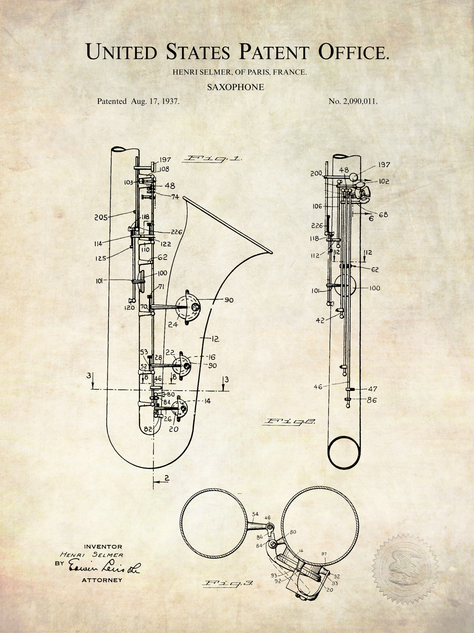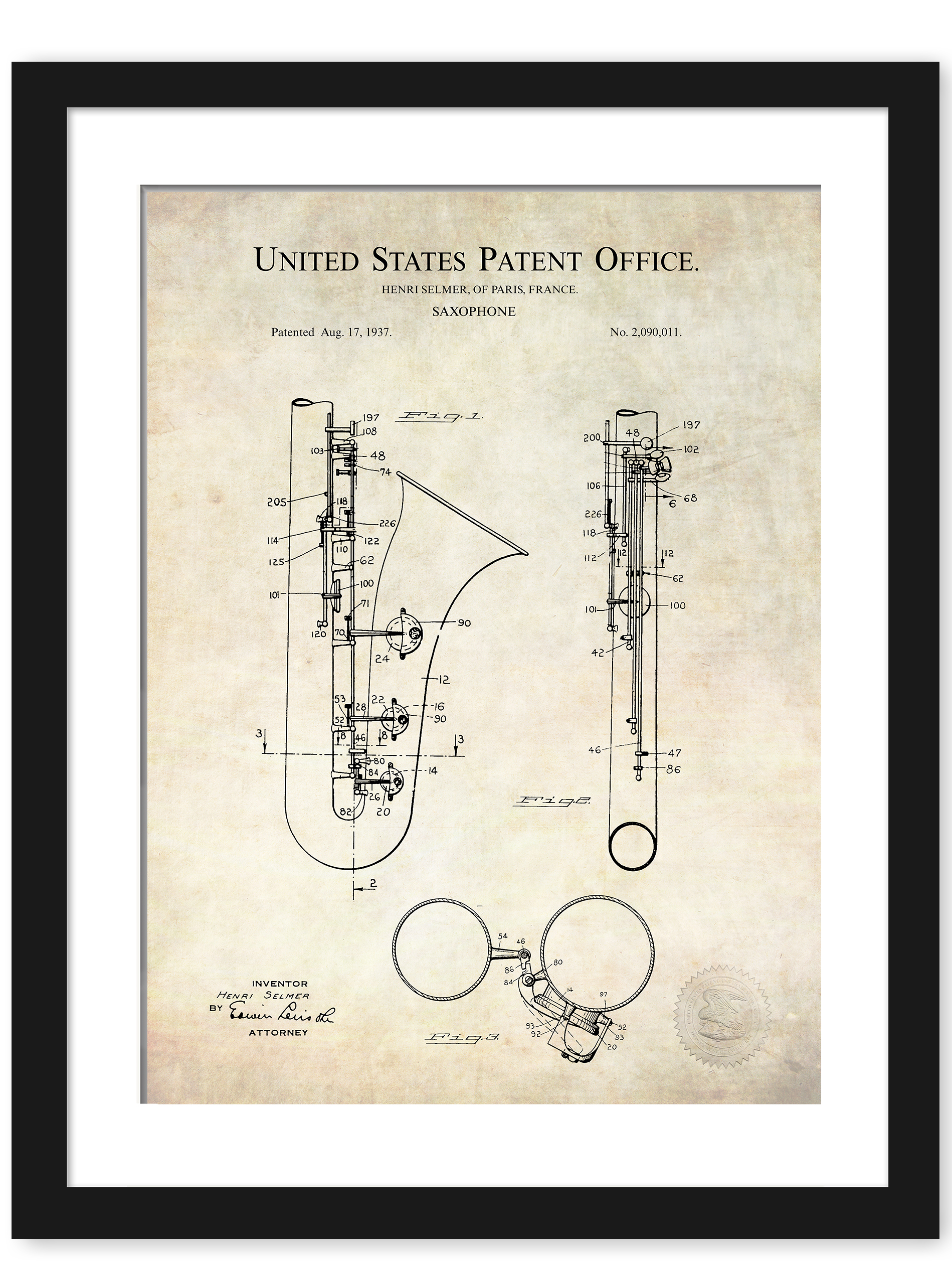 This art print, featuring the 1937 patent of a Saxophone crafted by Henri Selmer, isn’t just a piece of decor but a slice of history for music aficionados and interior design enthusiasts alike. The intricacies of this iconic instrument are captured in meticulous detail, highlighting the timeless elegance of Selmer’s design, which revolutionized the jazz world. Perfect for a music studio, living room, or a cozy corner that celebrates the golden era of jazz.