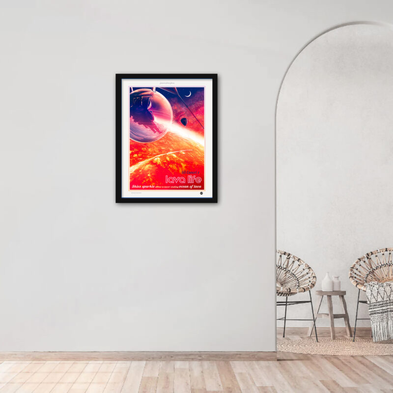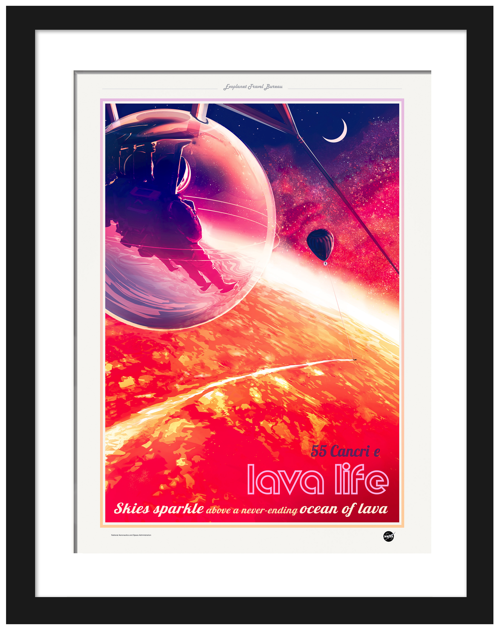 This print is from the NASA/JPL exoplanet travel posters. They were inspired by the charm and style of vintage WPA national park posters, evoking a nostalgic, retro-future sentiment. JPL’s vision was to blend the allure of space exploration with the artistic heritage of the past, emphasizing the scientific intrigue of these celestial bodies. Each poster is crafted to highlight unique features of distant worlds and solar system destinations. The project aimed to ignite the public’s imagination about the edges of possibility.