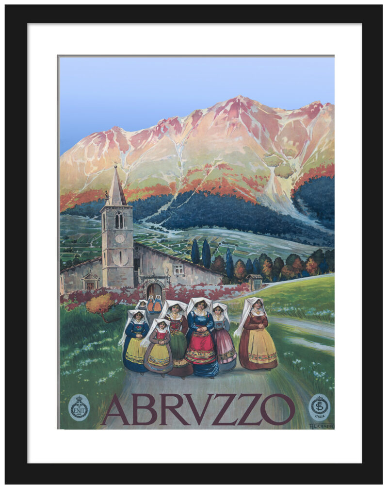 Vincenzo Alicandri, renowned for his vibrant portrayal of Italian landscapes, brings the region of Abruzzo to life in this exquisite vintage print. His work, characterized by a mastery of color and form, captures the serene beauty of Abruzzo’s traditional life against a backdrop of its rolling hills. This poster appeals to both admirers of Alicandri’s artistry and enthusiasts of Italian cultural heritage, making it an ideal gift or a cherished addition to any collection.