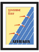 Embrace the spirit of Australian beaches with this stunning reproduction of the 1936 ‘Sunshine and Surf’ poster by Gert Sellheim. This artwork captures the vibrant essence of Australia’s surf culture, featuring swimmers in mid-dive against a strikingly colored backdrop