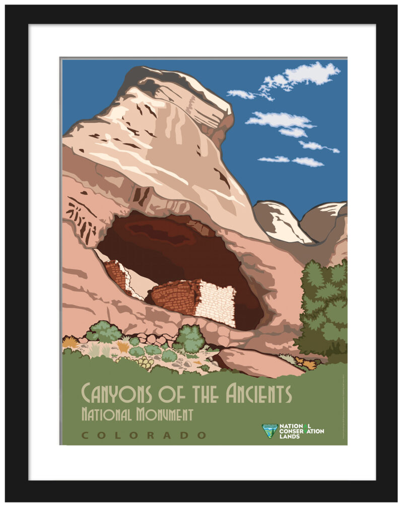 This art print captures the essence of Canyons of the Ancients National Monument in Colorado, showcasing Castle Rock Pueblo against a striking blue sky. Dating back to the 1950s, this historic site embodies ancient Puebloan culture. The vibrant hues and detailed illustration will appeal to history buffs and art lovers alike, offering a window into the past. Perfect as a gift or to elevate a living space, this reproduction invites viewers to appreciate the grandeur of American national monuments.