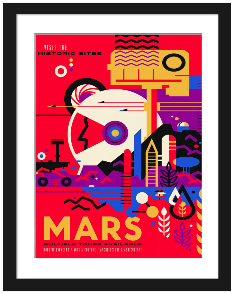 This Mars print, reminiscent of WPA national park posters, stirs the soul with its retro-futuristic charm. It celebrates human aspirations to explore the Red Planet, portrayed as historic milestones in interplanetary exploration. A testament to humanity’s dream to visit Mars, it’s perfect for space enthusiasts dreaming of future horizons.