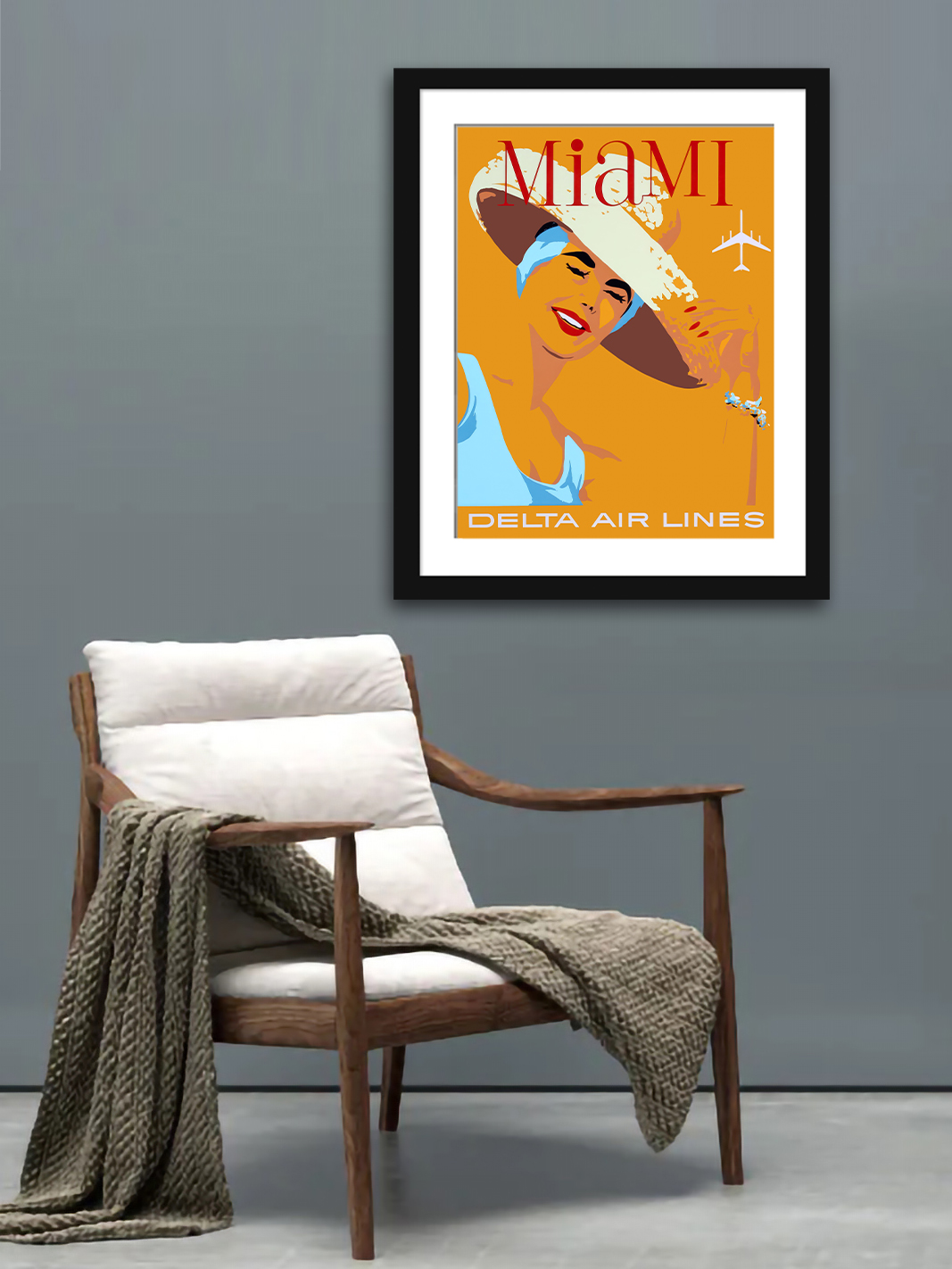 This reproduction of John Hardy’s 1960s Delta Air Travel Poster for Miami brings to life the vivid colors and dynamic spirit of Miami in the sixties. Featuring a chic woman basking under the Florida sun, this piece epitomizes the glamour and allure of the era. It’s an ideal addition to any collection of travel memorabilia or a striking piece for those drawn to retro style and the history of commercial aviation.