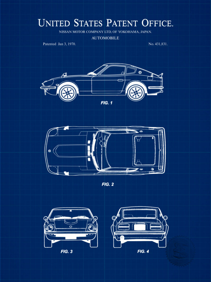 Print of the 1970 Nissan Motor Company automobile patent, featuring the timeless design of the 240Z