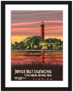 This stunning art print is a reproduction of a classic depiction of the iconic Jupiter Inlet Lighthouse. Situated in the heart of Florida, this piece captures the essence of coastal tranquility and historic charm. Ideal for those who appreciate nautical heritage or are looking to add a touch of seaside serenity to their home decor. The warm palette and the lighthouse’s commanding presence make it a thoughtful gift for maritime enthusiasts and lovers of American landmarks.